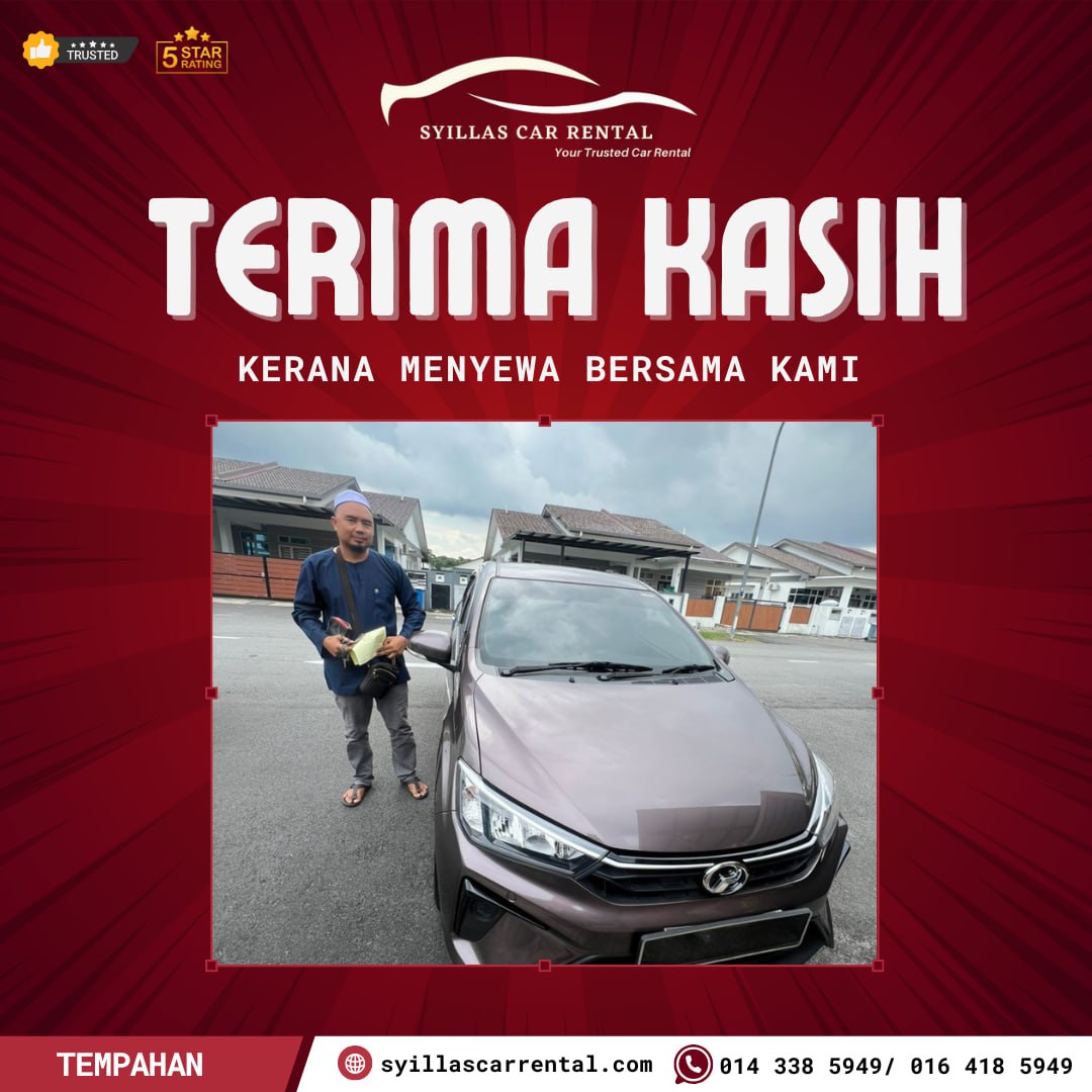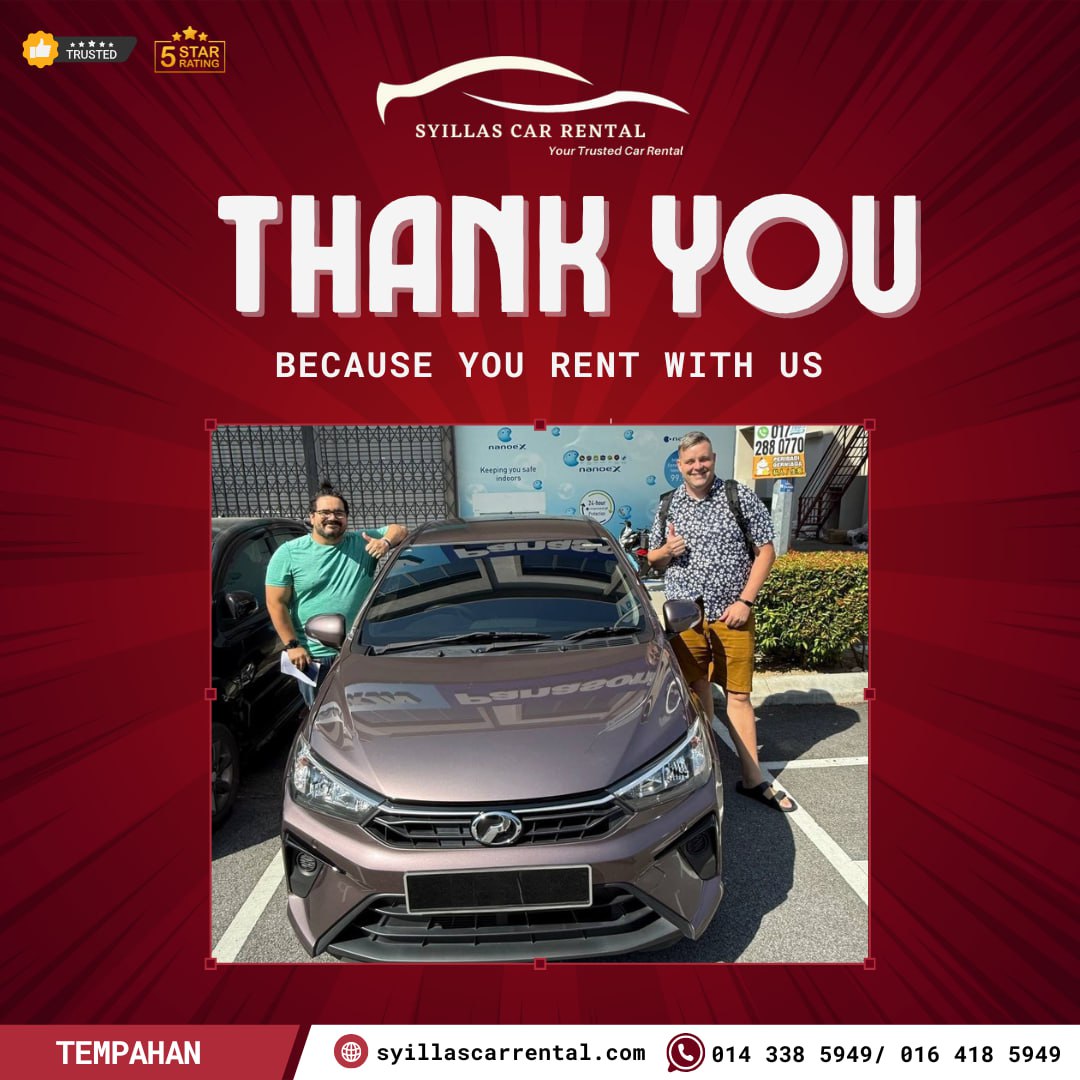 Di Syillas Car Rental, kepuasan pelanggan adalah keutamaan kami. Kami berbangga kerana telah membantu ramai pelanggan menikmati perjalanan yang selesa dan lancar dengan perkhidmatan kereta sewa kami.